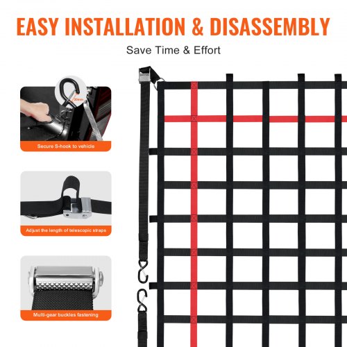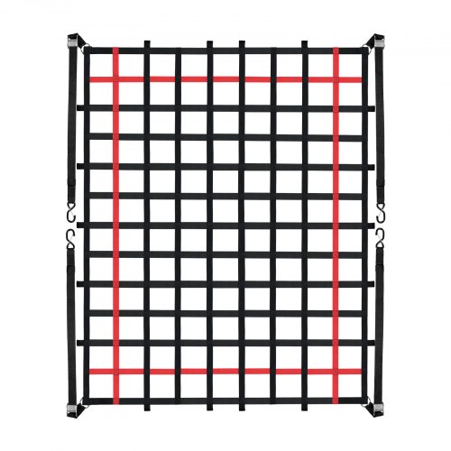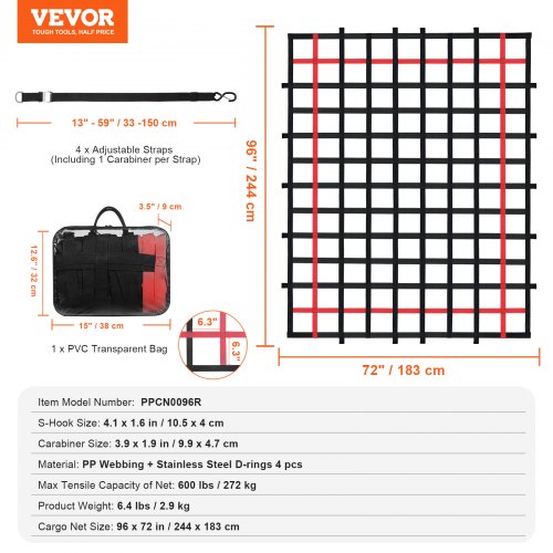 VEVOR Cargo Net Heavy Duty Cargo Net 96" x 72" Adjustable Buckles & S-HooksStrong Load-bearing CapacityWear-resistant & WeatherproofFlexible Adjustment & FixingTight Mesh ProtectionEasy Installation & UsageConvenient Organization & StorageS-Hook Inner Ring Diameter: 0.1 in / 30 mm,S-Hook Size: 4.1 x 1.6 in / 105 x 40 mm,Adjustable Strap Size: 13 - 59 in / 330 - 1500 mm,Carabiner Size: 3.9 x 1.9 in / 99 x 47 mm,Max Tensile Capacity of Net: 600 lbs / 272 kg,Hole Size: 6.3 x 6.3 in / 160 x 160 mm,Item Model Number: PPCN0096R,Product Weight: 6.4 lbs / 2.9 kg,Material: PP Webbing + Stainless Steel D-rings 4 pcs,Cargo Net Size: 96 x 72 in / 2440 x 1830 mm,Product Dimensions: 100 x 76 x 0.3 in / 2540 x 1930 x 8 mm (Fully Expanded)