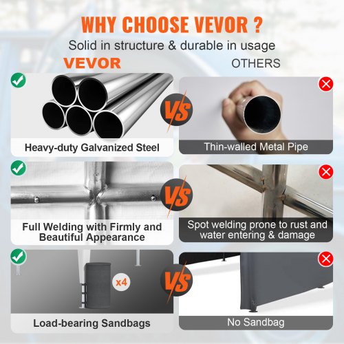 VEVOR Carport, 10x20 ft Heavy Duty Car Canopy Garage Boat Shelter Party Tent with 8 Reinforced Poles and 4 Weight Bags, UV Resistant Waterproof All-Season Tarp for SUV, F150, Car, Truck, BoatWindproof & Reinforced FrameStability GuaranteedTie-down with EaseSuperior MaterialMade to LastApplicable to Various ActivitiesNumber of Columns: 8,Product Type: Heavy Duty Carport,Product Color: White,Column Diameter: 1.49 in / 38 mm,Product Weight: 105.8 lbs / 48 kg,Frame Material: Galvanized Steel Pipe,Max. Wall Thickness: 0.05 in / 1.3 mm,Carport Cover Material: 180G/㎡ Double-sided Coating PE,Product Size: 10 x 20 x 9.3 FT / 3 x 6 x 2.8 m,Package Size: 42.1 x17.7 x12.9 in / 107 x 45 x 33 cm