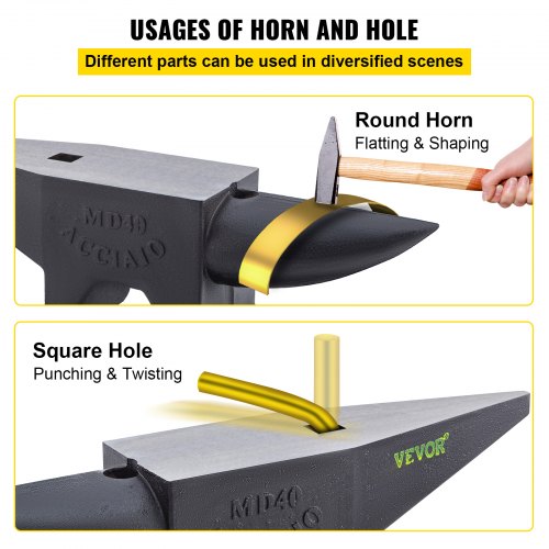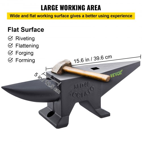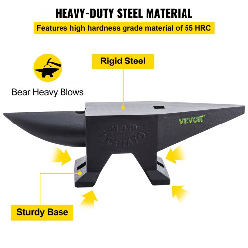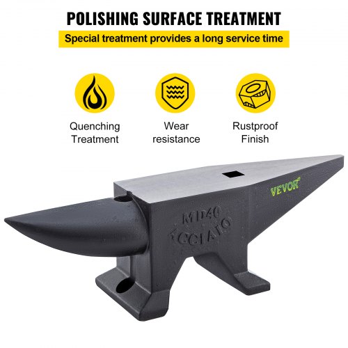 VEVOR Cast Iron Anvil, 88 Lbs(40kg) Single Horn Anvil with Large Countertop and Stable Base, High Hardness Rugged Round Horn Anvil Blacksmith, for Bending, ShapingForged Steel ConstructionUsages of Hole & HornQuenching TreatmentSolid & Stable DesignLarge CountertopVarious ApplicationRound Hole: 1 inch/25 mm,Length: 23.3"/592 mm,Model: 88BLACK,Hardy Hole: 0.9" x 0.9"/22 x 22 mm,Material: Hard Steel,Height: 6.7"/170 mm,Hardness: 55 HRC,Width: 6.4"/162 mm,Weight: 88 lbs/40 kg,Base: 9" x 6.4"/232 x 162 mm