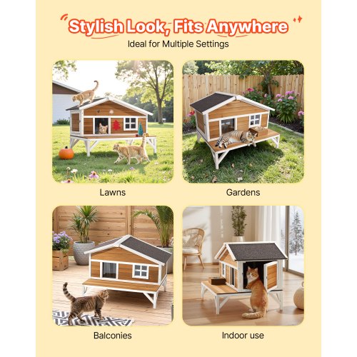 VEVOR Insulated Cat House Outdoor Waterproof Wooden Cat Shelter with Platform<br/>Cozy & Durable Home<br/>Happiness Boost for Cats<br/>Dry & Comfortable<br/>Spacious Activity Zoned<br/>Year-Round Comfort<br/>Warm in Winter<br/>Item Material: Solid Fir Wood, Asphalt Felt, PVC Door Curtain,Color: White & Wood Color,Item Model Number: DUSCH2509,Item Dimensions: 43.50 × 33.58 × 30.98 inch / 1105 × 853 × 787 mm,Net Weight: 44.09 lbs / 20.0 kg