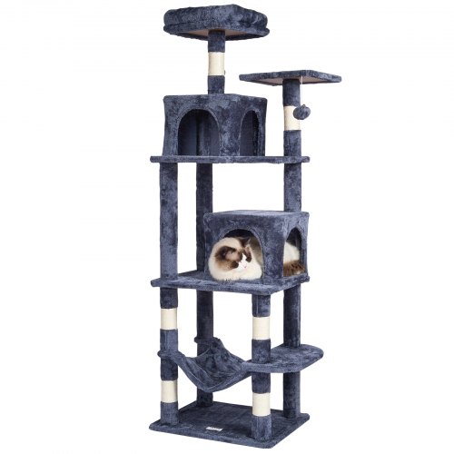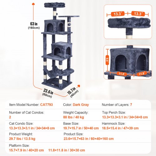 VEVOR Cat Tree 63" Cat Tower with 2 Cat Condos Sisal Scratching Post Light GreyMulti-Platform Cat TreeHaven for CatsPlayground for CatsSafety AssuranceFlexible and VersatileQuick InstallationCat Condo Size: 11.8"×11.8"×9.8"/30x30x25 cm ,Hammock Size: 18.5"x15.4"/47x39cm,Top Perch Size: 13.3"×13.3"×3.1"/34×34×8 cm,Number of Layers: 7,Number of Cat Condos: 2,Weight Capacity: 88lbs/40kg,Base Size: 19.7"x15.7"/50x40 cm,Color: Dark Grey,Item Model Number: CAT793,Product Weight: 29.7 lbs/13.5kg,Product Size: 23.6"×15.7"×63"/60x40x160 cm