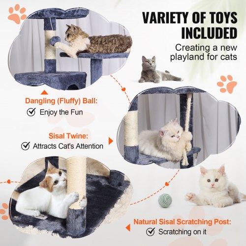 VEVOR Cat Tree 72" Cat Tower with 2 Cat Condos Sisal Scratching Post Dark GreyMulti-Platform Cat TreeHaven for CatsPlayground for CatsSafety AssuranceFlexible and VersatileQuick InstallationCat Condo Size: 17.7"×11.8"×11.8"/45×30×30 cm;11.8"×11.8"×11.8"/30×30×30 cm,Hammock Size: 17.7"×13.8"/45×35 cm,Top Perch Size: 13.3"×13.3"×3.1"/34×34×8 cm,Number of Layers: 9,Number of Cat Condos: 2,Weight Capacity: 130 lbs/58.9 kg,Base Size: 21.6"×17.7"/55×45 cm,Color: Dark Grey,Item Model Number: CAT795,Product Weight: 33.5lbs/15.2 kg,Product Size: 28.3"×27.5"×72"/72×70×183 cm