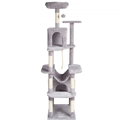 VEVOR Cat Tree 72" Cat Tower with 2 Cat Condos Sisal Scratching Post Light GreyMulti-Platform Cat TreeHaven for CatsPlayground for CatsSafety AssuranceFlexible and VersatileQuick InstallationCat Condo Size: 17.7"×11.8"×11.8"/45×30×30 cm;11.8"×11.8"×11.8"/30×30×30 cm,Hammock Size: 17.7"×13.8"/45×35 cm,Top Perch Size: 13.3"×13.3"×3.1"/34×34×8 cm,Number of Layers: 9,Number of Cat Condos: 2,Weight Capacity: 130 lbs/58.9 kg,Base Size: 21.6"×17.7"/55×45 cm,Color: Light Grey,Item Model Number: CAT795,Product Weight: 33.5lbs/15.2 kg,Product Size: 28.3"×27.5"×72"/72×70×183 cm