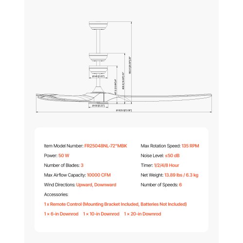 VEVOR 72 Inch Ceiling Fan without Light, 6-Speed Remote Control, 3-Wood-Blade, Reversible DC Motor, Modern Low Profile Flush Mount Exterior Fan for Bedroom, Living Room, Patio, Indoor/Outdoor, Black3 Different Sized DownrodsInstallation Made EasyMatch Various Home Decor StylesEffortless InstallationVersatile & StylishEasy to CleanProduct Dimensions(10-in Downrod): Φ70.87 x 16.09"/Φ1800 x 408.6 mm,Product Dimensions(20-in Downrod): Φ70.87 x 26.09"/Φ1800 x 662.8 mm,Color: Black,Max Airflow Capacity: 10000 CFM,Product Dimensions(6-in Downrod): Φ70.87 x 12.09"/Φ1800 x 307.2 mm,Number of Speeds: 6,Wind Directions: Upward, Downward,Noise Level: ≤50 dB,Timer: 1/2/4/8 Hour,Max Rotation Speed: 135 RPM,Item Model Number: FR25048NL-72"MBK,Number of Blades: 3,Net Weight: 13.89 lbs / 6.3 kg,Power: 30 W