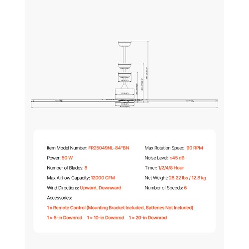 VEVOR 84 In Ceiling Fan without Light, 6-Speed Remote Control, Aluminum 8-Blade, Reversible DC Motor, Modern Low Profile Flush Mount Fan for Bedroom, Living Room, Patio, Indoor/Outdoor, Brushed Nickel3 Different Sized DownrodsInstallation Made EasyMatch Various Home Decor StylesEffortless InstallationVersatile & StylishEasy to Clean20-in Downrod: Φ84.25 x 27.79"/Φ2140 x 705.8 mm,Color: Brushed Nickel,Max Airflow Capacity: 12000 CFM,6-in Downrod: Φ84.25 x 13.79"/Φ2140 x 350.2 mm,Product Dimensions:,Number of Speeds: 6,10-in Downrod: Φ84.25 x 17.79"/Φ2140 x 451.8 mm,Wind Directions: Upward, Downward,Noise Level: ≤45 dB,Timer: 1/2/4/8 Hour,Max Rotation Speed: 90 RPM,Item Model Number: FR25049NL-84"BN,Number of Blades: 8,Net Weight: 28.22 lbs / 12.8 kg,Power: 53 W