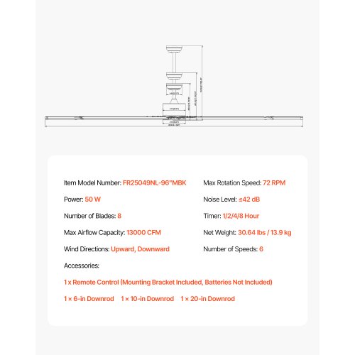 VEVOR 96 In Ceiling Fan without Light, 6-Speed Remote Control, Aluminum 8-Blade, Reversible DC Motor, Modern Low Profile Flush Mount Exterior Fan for Bedroom, Living Room, Patio, Indoor/Outdoor, Black3 Different Sized DownrodsInstallation Made EasyMatch Various Home Decor StylesEffortless InstallationVersatile & StylishEasy to CleanProduct Dimensions(10-in Downrod): Φ95.67 x 17.79"/Φ2430 x 451.8 mm,Product Dimensions(20-in Downrod): Φ95.67 x 27.79"/Φ2430 x 705.8 mm,Color: Black,Max Airflow Capacity: 13000 CFM,Product Dimensions(6-in Downrod): Φ95.67 x 13.79"/Φ2430 x 350.2 mm,Number of Speeds: 6,Wind Directions: Upward, Downward,Noise Level: ≤42 dB,Timer: 1/2/4/8 Hour,Max Rotation Speed: 72 RPM,Item Model Number: FR25049NL-96"MBK,Number of Blades: 8,Net Weight: 30.64 lbs / 13.9 kg,Power: 54 W