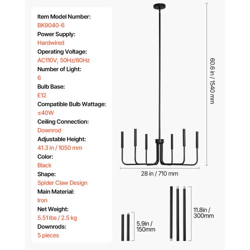 6-Light Chandelier Black Modern Chandelier Adjustable Height for CeilingsSix-Light ChandelierEasy Bulb ChangeQuick InstallationPractical and StylishVersatile UseStable and SteadyCeiling Connection: Downrod,Shape: Spider Claw Design,Bulb Base: E12,Color: Black,Compatible Bulb Wattage: ≤40W,Power Supply: Hardwired,Adjustable Height: 41.3 in / 1050 mm,Product Dimensions (with All Downrods): 228 x 28 x 60.6 in / 710 x 710 x 1540 mm,Operating Voltage: AC110V, 50Hz/60Hz,Item Model Number: BK9040-6,Downrods: 5 pieces,Product Dimensions (L x W x H): 28 x 28 x 12 in / 710 x 710 x 305 mm,Number of Light: 6,Net Weight: 5.51 lbs / 2.5 kg,Main Material: Iron