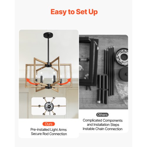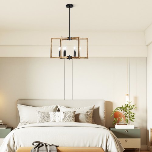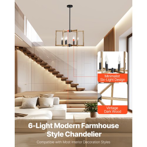 6-Light Chandelier Metal Modern Chandelier Adjustable Height for CeilingsSix-Light ChandelierEasy Bulb ChangeQuick InstallationPractical and StylishVersatile UseStable and SteadyCeiling Connection: Downrod,Shape: Lantern,Bulb Base: E12,Color: Black + Dark Wood,Compatible Bulb Wattage: ≤40W,Power Supply: Hardwired,Adjustable Height: 41.3 in / 1050 mm,Product Dimensions (with All Downrods): 21.6 x 21.6 x 63.8 in / 550 x 550 x 1620 mm,Operating Voltage: AC110V, 50Hz/60Hz,Item Model Number: BK9021-6,Downrods: 5 pieces,Product Dimensions (L x W x H): 21.6 x 21.6 x 12.8 in / 550 x 550 x 325 mm,Number of Light: 6,Net Weight: 6.83 lbs / 3.1 kg,Main Material: Iron
