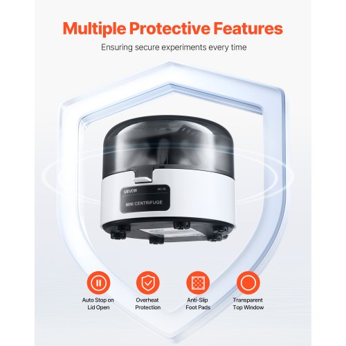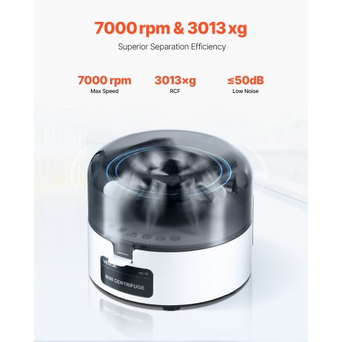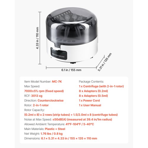 Mini Centrifuge Machine 0.2/1.5/2ml Fixed Speed 7000rpm with 2-in-1 RotorHigh-speed Centrifuge DriveCompatible with Various Tube SizesThoughtful DetailsCompact DesignVersatile ApplicationSymmetrical PlacementMain Materials: Plastic + Steel,RCF: 3013 xg,Rotor Capacity: (0.2ml x 8) x 2 rows (strip tubes) + 1.5/2.0ml x 8 (centrifuge tubes),Allowed Ambient Temperature: 41℉-104℉ / 5-40℃,Noise at Max Speed: ≤50dB(A) (measured at 39.4 in/1m radius),Item Model Number: MC-7K,Dimensions: 6.1 x 5.31 x 4.33 in / 155 x 135 x 110 mm,Direction: Counterclockwise,Rotor: 2-in-1 rotor,Net Weight: 1.76 lbs / 0.8 kg,Max Speed: 7000±5% rpm (fixed speed)