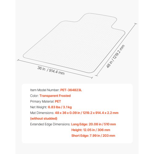VEVOR Chair Mat with Lip 36 x 48-inch Office Chair Mat for Carpeted Floors<br/>Large Chair Mat<br/>Smooth Gliding<br/>Secures Carpet<br/>Quality Details<br/>Wide Application<br/>High Transparency<br/>Primary Material: PET,Extended Edge Dimensions: Long Edge: 20.08 in / 510 mm; Height: 12.05 in / 306 mm; Short Edge: 7.99 in / 203 mm,Color: Transparent Frosted,Item Model Number: PET-364823L,Mat Dimensions: 48.11 x 36.02 x 0.09 / 1222 x 915 x 2.2 mm (without studded),Net Weight: 6.83 lbs / 3.1 kg