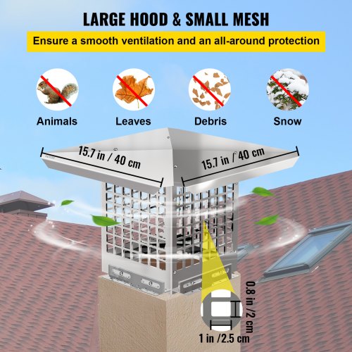 VEVOR Chimney Cap, 8" x 8" Flue Caps, 304 Stainless Steel Fireplace Chimney Cover, Adjustable Metal Spark Arrestor with Bolts Screws, Mesh Chimney Flue Cover for Outside Existing Clay Flue Tile8'' x 8'' Chimney CoverDurable Stainless SteelExcellent VentilationProtect Your ChimneyPre-drilled AssemblyOutdoor ApplicationsBottom Size: 8 x 8 in/ 20 x 20 cm,Fit Chimney Size: 6.5 x 6.5 in/ 16.5 x 16.5 cm to 10.4 x 10.4 in/ 26.5 x 26.5 cm,Top Size: 15.7 x 15.7 in/ 40 x 40 cm,Each Mesh Size: 1 x 0.8 in/ 2.5 x 2 cm,Item Height: 10.6 in/ 27 cm,Color: Silver,Model: VV-YCZ-88,Material: 304 Stainless Steel,Weight: 6 lbs/ 2.7 kg