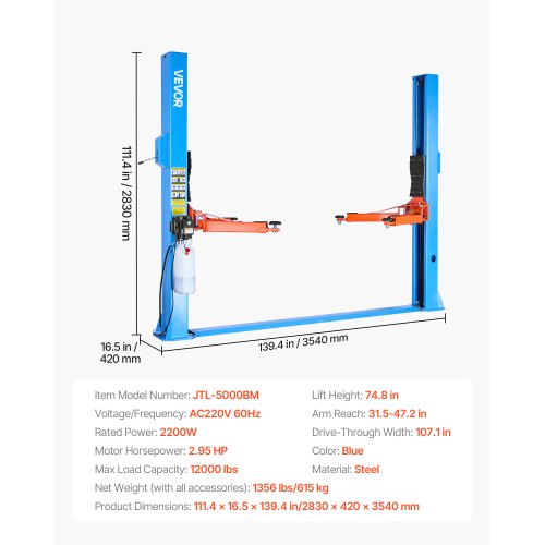 VEVOR 2 Post Lift Two Post Lift 12000 lbs Auto Lift Car Lift Hoist Equipment<br/>Stable Lifting Choice<br/>No Bending Required<br/>Easy to Operate<br/>Durable for Long-Term Use<br/>Versatile Applications<br/>Two-Stage Arm Design<br/>Voltage/Frequency: AC220V 60Hz,Motor Horsepower: 2.95 HP,Arm Reach: 31.5-47.2 in,Color: Blue,Item Model Number: JTL-5000BM,Max Load Capacity: 12000 lbs,Lift Height: 74.8 in,Rated Power: 2200W,Material: Steel,Product Dimensions (L x W x H): 111.4 x 16.5 x 139.4 in/2830 x 420 x 3540 mm,Net Weight (with all accessories): 1356 lbs/615 kg,Drive-Through Width: 107.1 in