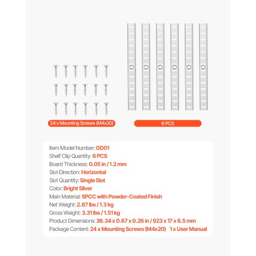 VEVOR Shelf Track 36.3-inch 6 Pack Adjustable Steel Wall Mounted Shelf PilasterMaximize Your StorageAdjustable HeightFlexible Width FitBuilt to LastSmart & StylishClean, Modern LookSlot Quantity: Single Slot,Gross Weight: 3.31 lbs / 1.51 kg,Shelf Clip Quantity: 6 PCS,Color: Bright Silver,Item Model Number: GD01,Slot Direction: Horizontal,Product Dimensions: 36.34 x 0.67 x 0.26 in / 923 x 17 x 6.5 mm,Net Weight: 2.87 lbs / 1.3 kg,Board Thickness: 0.05 in / 1.2 mm,Main Material: SPCC with Powder-Coated Finish