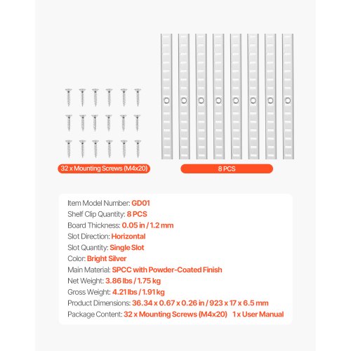 VEVOR Shelf Track 36.3-inch 8 Pack Adjustable Steel Wall Mounted Shelf PilasterMaximize Your StorageAdjustable HeightFlexible Width FitBuilt to LastSmart & StylishClean, Modern LookSlot Quantity: Single Slot,Gross Weight: 4.21 lbs / 1.91 kg,Shelf Clip Quantity: 8 PCS,Color: Bright Silver,Item Model Number: GD01,Slot Direction: Horizontal,Product Dimensions: 36.34 x 0.67 x 0.26 in / 923 x 17 x 6.5 mm,Net Weight: 3.86 lbs / 1.75 kg,Board Thickness: 0.05 in / 1.2 mm,Main Material: SPCC with Powder-Coated Finish