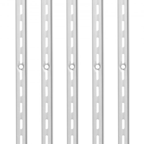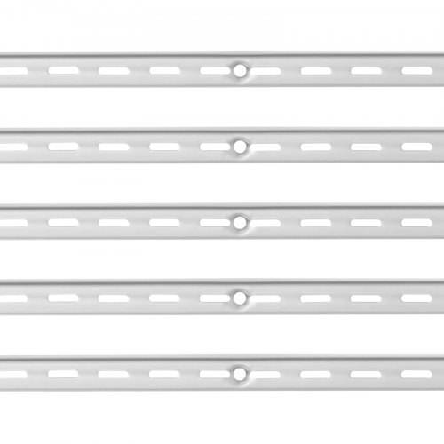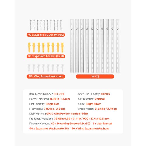 VEVOR Shelf Track 39-inch 10 Pack Adjustable Steel Wall Mounted Shelf PilasterMaximize Your StorageAdjustable HeightFlexible Width FitBuilt to LastSmart & StylishClean, Modern LookSlot Quantity: Single Slot,Gross Weight: 8.33 lbs / 3.78 kg,Shelf Clip Quantity: 10 PCS,Color: Bright Silver,Item Model Number: DCLZ01,Slot Direction: Vertical,Product Dimensions: 38.98 x 0.69 x 0.41 in / 990 x 17.6 x 10.5 mm,Net Weight: 7.80 lbs / 3.54 kg,Board Thickness: 0.06 in / 1.5 mm,Main Material: SPCC with Powder-Coated Finish