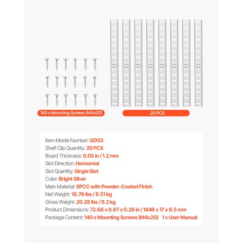 VEVOR Shelf Track 72.3-inch 20 Pack Adjustable Steel Wall Mounted Shelf PilasterMaximize Your StorageAdjustable HeightFlexible Width FitBuilt to LastSmart & StylishClean, Modern LookSlot Quantity: Single Slot,Gross Weight: 20..28 lbs / 9.2 kg,Shelf Clip Quantity: 20 PCS,Color: Bright Silver,Item Model Number: GD03,Slot Direction: Horizontal,Product Dimensions: 72.68 x 0.67 x 0.26 in / 1846 x 17 x 6.5 mm,Net Weight: 18.76 lbs / 8.51 kg,Board Thickness: 0.05 in / 1.2 mm,Main Material: SPCC with Powder-Coated Finish