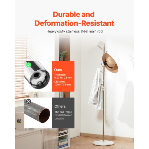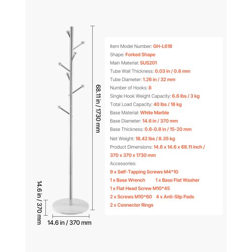 VEVOR Coat Rack Freestanding Coats Rack Stand with Stable Marble Base & 8 Hooks<br/>Distinctive Design<br/>Stable Weight Capacity<br/>Multiple Hooks<br/>No More Scratches<br/>Multi-Scene Application<br/>Anti-Slip Bottom Pad<br/>Shape: Forked Shape ,Tube Wall Thickness: 0.03 in / 0.8 mm,Base Thickness: 0.6-0.8 in / 15-20 mm ,Total Load Capacity: 40 lbs / 18 kg,Product Dimensions: 14.57 x 14.57 x 68.11 inch / 370 x 370 x 1730 mm,Single Hook Weight Capacity: 6.6 lbs / 3 kg,Base Diameter: 14.6 in / 370 mm,Item Model Number: GH-L618,Number of Hooks: 8,Net Weight: 18.42 Ibs / 8.35 kg,Main Material: SUS201,Base Material: White Marble ,Tube Diameter: 1.26 in / 32 mm