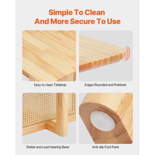 VEVOR Rattan Coffee Table, Rectangle Rattan Woven Wood Mid Century Coffee Table with Rubber Wood Top, 47-Inch Modern Boho Storage Coffee Table with Natural Wood Legs, for Living Room, Bedroom & Small SpacesRattan Coffee TablePremium MaterialsSpacious SurfaceEasy AssemblyVersatile DesignSecurity FeaturesShape: Rectangle,Frame / Tabletop / Support Feet Material: Rubberwood,Load Capacity: 250 lbs / 113.4 kg,Color: Original Wood Color,Item Model Number: CT-SR-01,Rattan Material: PE Rattan,Net Weight: 11.25 kg / 24.8 lbs,Product Size: 47.2 x 23.6 x 15.7 in / 1200 x 600 x 400 mm