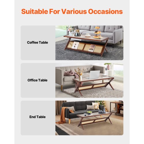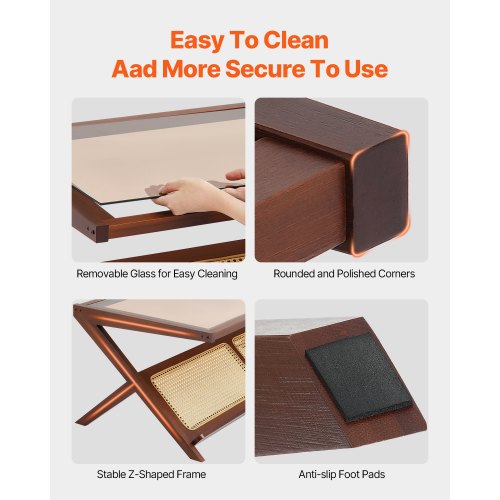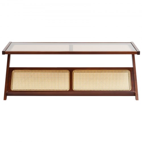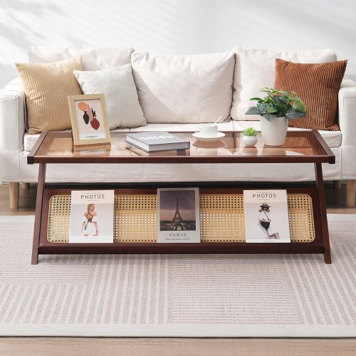 VEVOR Rattan Coffee Table, Z-Shaped Rattan Woven Bamboo End Table with Tempered Glass Top, 47” Modern Boho Storage Mid Century Coffee Table with Natural Bamboo Legs, for Living Room, Bedroom & Small Spaces, WalnutRattan Coffee TablePremium MaterialsAmple StorageEasy AssemblyVersatile DesignThoughtful DesignFrame / Support Feet Material: Bamboo,Shape: Z-shaped,Load Capacity: 110 lbs / 49.9 kg,Color: Walnut,Item Model Number: NR-GR-02,Tabletop Material: Tempered Glass,Rattan Material: PE Rattan,Net weight: 12.4 kg / 27.3 lbs,Layer: 1,Product Size: 47.2 x 22.0 x 17.1 in / 1200 x 559 x 435 mm