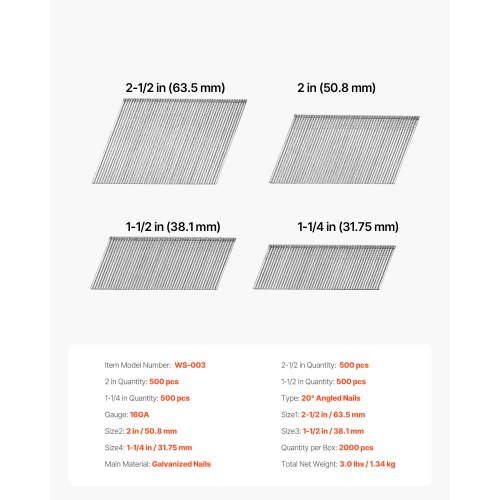 16 Gauge Angled Finish Nails 2000-Count (2-1/2 in,2 in,1-1/2 in,1-1/4 in)Finish Nail SetGalvanized Rust-ResistantStrong PenetrationWide CompatibilityWide ApplicationsConvenient Installation2 in Quantity: 500 pcs,Total Net Weight: 3.0 lbs / 1.34 kg,1-1/2 in Quantity: 500 pcs,Quantity per Box: 2000 pcs,Gauge: 16GA,Size4: 1-1/4 in / 31.75 mm,Size3: 1-1/2 in / 38.1 mm ,Type: 20° Angled Nails,Size2: 2 in / 50.8 mm ,Size1: 2-1/2 in / 63.5 mm ,Item Model Number: WS-003,1-1/4 in Quantity: 500 pcs,2-1/2 in Quantity: 500 pcs,Main Material: Galvanized Nails