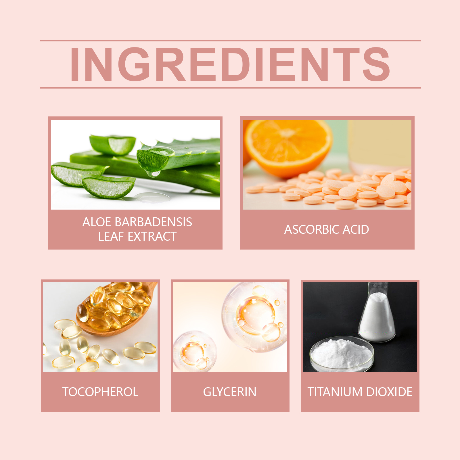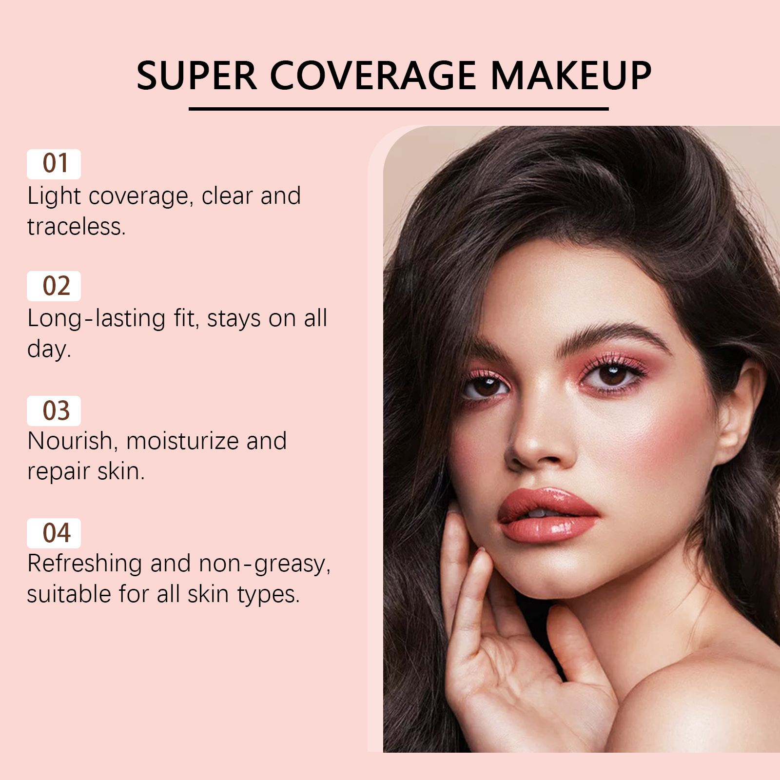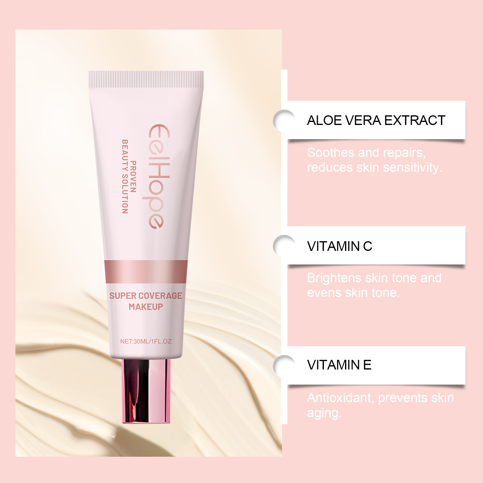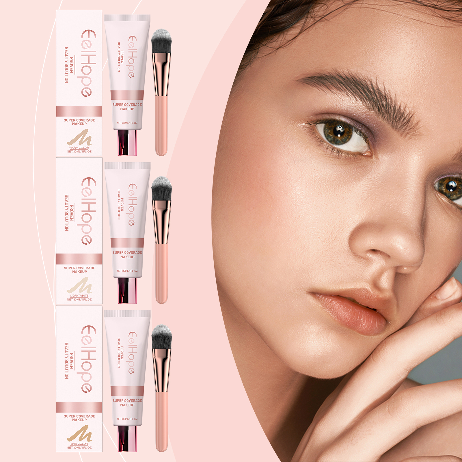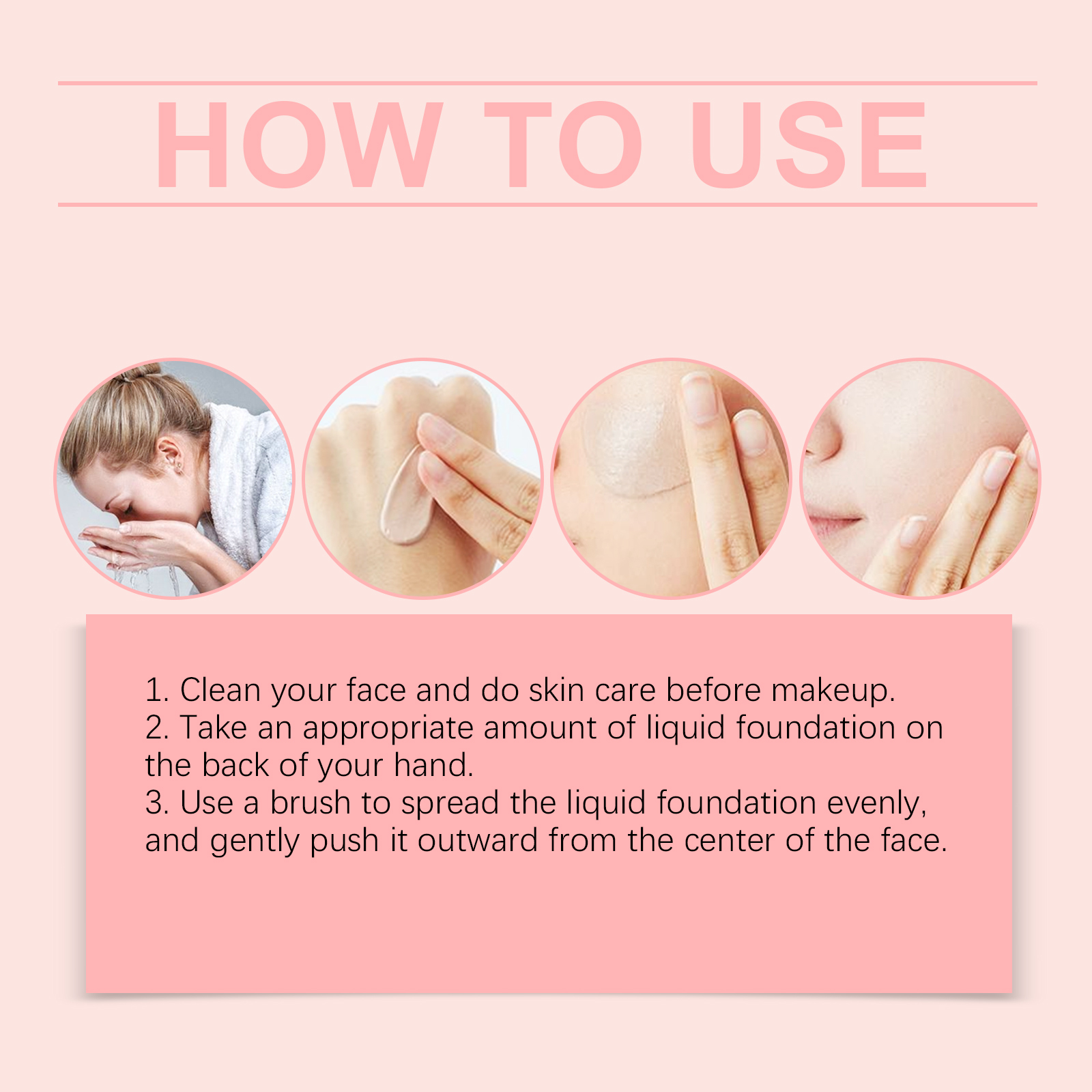 Our concealer foundation contains glycerin, aloe vera extract and vitamin C. It deeply nourishes the skin and keeps it hydrated. The way to use it is very simple: 1. Wash your face and do skin care before makeup. 2. Take a proper amount of liquid foundation on the back of your hand. 3. Apply the foundation evenly with a brush, gently pushing it outward from the center of your face. The lightweight texture easily hides blemishes and creates a natural, flawless look. Long-lasting makeup throughout the day, without removing or darkening, leaves skin glowing.