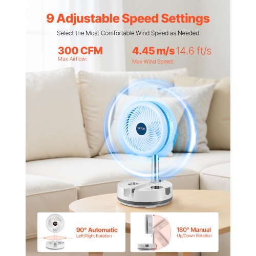 10 inch Foldable Rechargeable Oscillating Fan 3 in 1 Remote 9 SpeedsMulti-Functional Rechargeable FanStrong Wind PowerHelps You SleepVersatile UseThoughtful DetailsCompact and PortableWind Speed (m/s): 9 Speeds,Unfolded Max Dimensions: 10.4 x 10.4 x 31.5 in / 265 x 265 x 800 mm,Max Airflow: 300 CFM / 8,490 L/min,Battery Capacity: 40,000mAh,Item Model Number: A14,Folded Dimensions: 10.2 x 10.2 x 6.7 in / 260 x 260 x 170 mm,Remote Control Range: 5m / 16.4 ft,Main Material: ABS,Item Weight: 6.59 lbs / 2.99 kg,Timer Settings: 1H, 2H, 4H, 8H