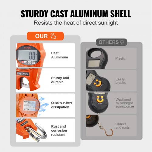VEVOR Digital Crane Scale, 660 lbs/300 kg, Industrial Heavy Duty Hanging Scale with Cast Aluminum Case & LCD Screen, Handheld Mini Crane with Hooks for Farm, Hunting, Fishing, Outdoor, Garage (Orange)Weighing Done RightTough Stuff7 Super FeaturesLCD MagicSecurity FirstPick Your UnitAccuracy: 0.1 lb/0.05 kg,Item Model Number: SF918,Product Weight: 1.38 lb/0.63 kg,Min Weighing Capacity: 0.3 lb/0.15 kg,Max Weighing Capacity: 660 lb/300 kg,Measurement Units: lb/kg/N,Product Size: 12.32 x 3.34 x 1.45 in/313 x 85 x 37 mm