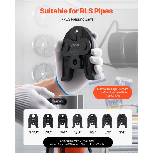 VEVOR RLS Press Jaws 7PCS Pressing Jaws 1/4" to 1-1/8" for Standard Press Tools7PCS Pressing JawsApplicable PipesCompatibile Press ToolsSturdy and DurableEasy to CarrySuitable for Various ScenariosApplicable Pipe: RLS Pipes,Item Model Number: RLS1/4-1-1/8",Product Weight: 35.94 lbs / 16.3 kg,Applicable Pipe Range: 1/4" to 1-1/8" ,Product Dimensions: 16.34 x 11.6 x 6.1 in / 415 x 295 x 155 mm