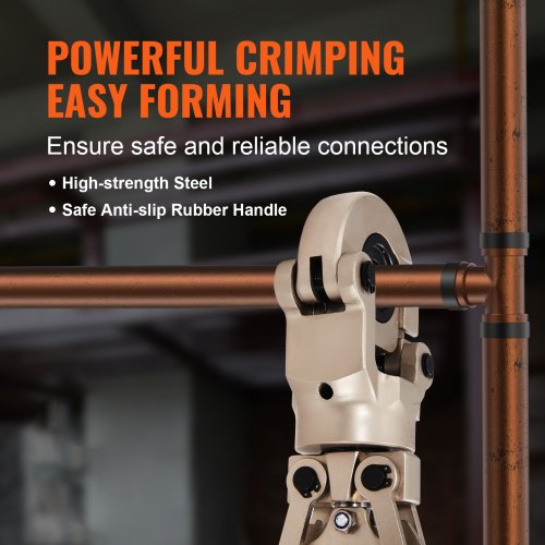 VEVOR Copper Press Tool Tube Fittings Crimping Kit, Pro Press Crimper with 1/2", 3/4", 1" Quick Change Jaws, 360° Rotatable Crimp Tool & Locking Pin, Extendable Handle, Meet ASTM B88 and B75 StandardHigh Efficiency3 Crimping Dies360° Rotating HeadCompact BodyHigh-strength Steel Crimping ToolEasy OperationCrimping Range: 1/2", 3/4", 1",Item Model Number: JT-1632,Product Weight: 8.8 lbs / 4 kg,Product Length: 21.1"-29.7"/ 535-755mm,Product Dimensions: 19.7"x 5.1"x 2.4"/ 500x130x60mm,Main Material: 45# Steel