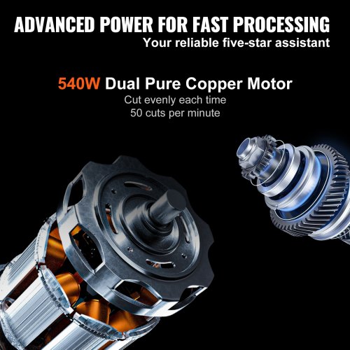 VEVOR Automatic Meat Slicer, 540W Deli Slicer, 2 PCS 10" Stainless Steel Removable Blade, 0-15mm Adjustable Thickness, Child Lock Protection, Food Slicer Machine for Meat Cheese Bread for Home UseBuilt-in SharpeningBlade GuardNon-slip FeetBlade Stay Sharp ForeverReliability & SecurityVersatile UseBlade Material: Alloy Steel 75Cr1,Blade Diameter: 10 inch / 250 mm,Body Material: Cast Aluminum ADC12 + SUS304,Output Power: 540W,Voltage: AC110~120V/60HZ,Slice Thickness: 0-0.6 inch / 0-15 mm,Model: SA-250A,Product Weight: 108 lb / 49 kg,Product Dimensions: 21 x 18.8 x 26 in / 535 x 478 x 660 mm