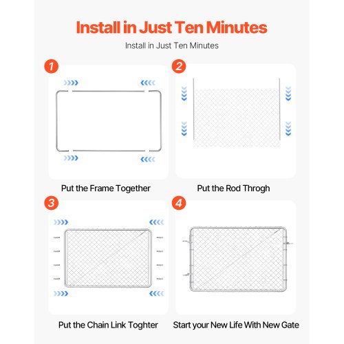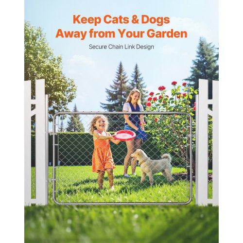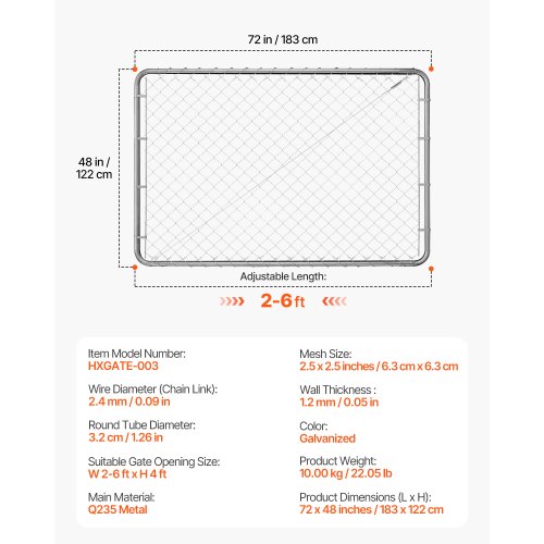 Chain Link Fence Gate Fit 2.2-6 ft x 6 ft Yard Garden Gate Posts Not IncludedHeavy-Duty Garden GateStylish & VersatileComplete AccessoriesSecurity & ProtectionThoughtful DetailsVersatile DesignSuitable Gate Size: W 2.2-6ft x H 6ft,Color: Galvanized,Item Model Number: HXGATE-003,Gate Dimensions (L x H): 72 x 48 inches / 183 x 122 cm,Product Weight: 10.00kg / 22.05lb,Wall Thickness: 1.2mm / 0.05in,Wire Diameter (Chain Link): 2.4mm / 0.09in,Product Dimensions: Length: 1830mm / 72.05in, Height: 1220mm / 48.03in,Mesh Size: 2.5 x 2.5 inches / 6.3cm,Round Tube Diameter: 3.2cm / 1.26in,Main Material: Q235 Metal