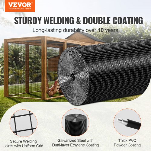 VEVOR Hardware Cloth, 24'' x 100' Galvanized Wire Mesh Roll, 19 Gauge Chicken Wire Fence Roll, Vinyl Coating Metal Wire Mesh for Chicken Coop Barrier, Rabbit Snake Fences, Poultry EnclosuresFlexible and Easy-to-installVarious ApplicationsLong-Lasting ProtectionThickened PackagingFor Small Animal ExclusionAvailable in Various SpecificationsItem Model Number: SS19121224100,Product Net Weight: 11.3kg ±3%,Coating: Galvanized + Black Vinyl,Mesh Size: 0.5inx0.5in/12.7x12.7 mm,Main Material: Galvanized Iron Wire + PVC,Wire Diameter: 19 Gauge/1.06 mm,Product Size: 24inx100ft/610x30480 mm