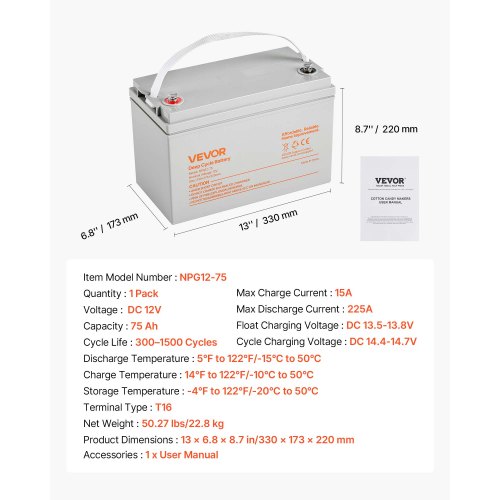 12V 75Ah Deep Cycle Battery Sealed AGM Rechargeable Lead Acid Battery Mobility<br/>Portable Handle<br/>Durable ABS Shell<br/>Includes Bolts<br/>AGM Sealed Technology<br/>Versatile for Multiple Applications<br/>30%-100% DOD<br/>Cycle Charging Voltage: DC 14.4-14.7V,Max Charge Current: 15A,Terminal Type: T16,Quantity: 1 Pack,Charge Temperature: 14°F to 122°F/-10℃ to 50℃,Cycle Life: 300–1500 Cycles,Max Discharge Current: 225A,Capacity: 75 Ah,Voltage: DC 12V,Item Model Number: NPG12-75,Float Charging Voltage: DC 13.5-13.8V,Discharge Temperature: 5°F to 122°F/-15℃ to 50℃,Storage Temperature: -4°F to 122°F/-20℃ to 50℃