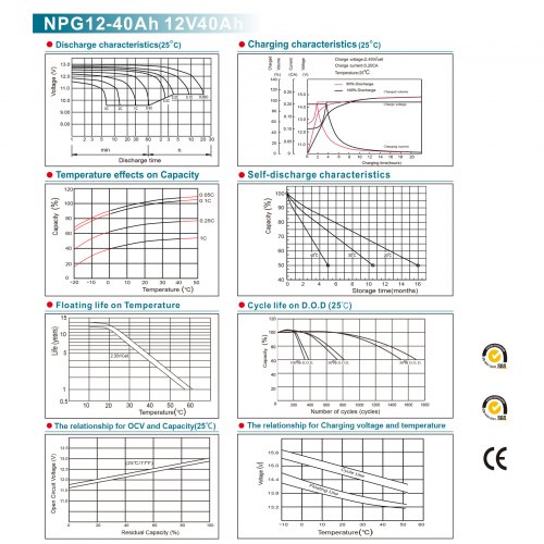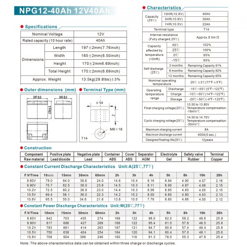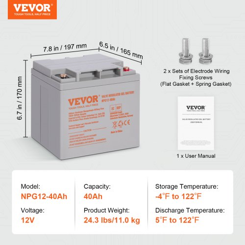 VEVOR Deep Cycle Battery, 12V 40AH, AGM Marine Rechargeable Battery, High Self-Discharge Rate 400A Discharge Current for Mobility Scooters Electric Wheelchairs Go-Karts e-Bikes, Tested to UL Standards12V 40Ah Deep Cycle BatteryAbsorbent Glass Mat Technology (AGM)Secure and DurableHigh PerformanceVersatile ApplicationFriendly NoteCapacity: 40Ah,Voltage: 12V,Item Model Number: NPG12-40Ah,Product Weight: 24.3 pounds / 11.0 kg,Product Dimensions: 7.8 x 6.5 x 6.7 in / 197 x 165 x 170 mm,Discharge Temperature: 5℉ to 122℉,Storage Temperature: -4℉ to 122℉