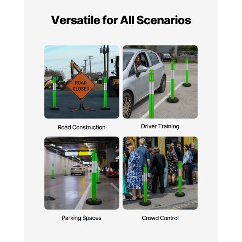 VEVOR 3 Packs Traffic Delineator Posts 48 in Safety Cones Fillable Base Green<br/>Cap<br/>360° Reflective Strips<br/>Fillable Base<br/>High-Quality Materials<br/>Detachable Design for Easy Transport<br/>Versatile Applications<br/>Number of Reflective Strips per Unit: 1 Piece, 9.45 in / 240 mm,Base Weight (Single): Filled with Sand: 12.35 lbs / 5.6 kg,Post Weight (Single): 1.54 lbs / 0.7 kg,Color: Green + Black,Item Model Number: WP-06P,Quantity: 3 pcs,Material: LDPE + PE,Base Dimensions: 13.78 x 13.78 x 2.56 in / 350 x 350 x 65 mm,Product Dimensions: φ13.78 x 44.88 in / φ350 x 1140 mm,Net Weight: 3.85 kg / 8.49 lbs,Post Dimensions: φ4.49 x 44.88 in / φ114 x 1140 mm