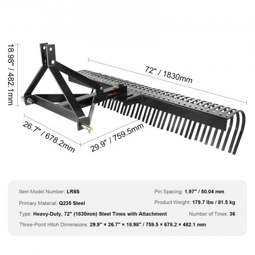 VEVOR Tow Behind Dethatcher, 72-inch Tow Dethatcher with 36 Steel Tines, 3-Point Lawn Dethatcher Rake with Attachments for Tractor, Landscape Rake for Garden, Farm, GrassDurable ConstructionCompatible DesignEasy OperationSimple InstallationReplaceable Steel TinesEffective Lawn Dethatcher RakePrimary Material: Q235 Steel,Type: Heavy-Duty, 72"(1830mm) Steel Tines with Attachment,Pin Spacing: 1.97"/50.04 mm,Item Model Number: LR6S,Product Weight: 179.7 lbs/81.5 kg,Three-Point Hitch Dimensions: 29.9" x 26.7" x 18.98"/759.5 x 678.2 x 482.1 mm,Number of Tines: 36