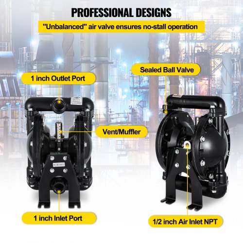 VEVOR Air-Operated Double Diaphragm Pump 1 inch Inlet Outlet Aluminum 35 GPM Max 120PSI for Industrial Use, QBY4-25LF46-1inch-35Sturdy Aluminum Alloy BodyPTFE Double DiaphragmProfessional Air-Operated DesignsSealed Ball ValveHandle Various MaterialVersatile UsesSuction: 0-5 m (0-16.4 ft),Diaphragm Material: PTFE,Air Inlet Size: NPT 1/2 inch (12.7 mm),Max Flow Rate: 24 GPM,Self-Priming Dry: 3 m (10 ft),Type: Air-operated Double diaphragm,Body Material: Aluminum Alloy,Max Suspended Solids: 3 mm (1/8 inch),Valve Type: Ball,Model: QBY4-25L F46,Self-Priming Wet: 4.6 m (15 ft),Inlet/Outlet Port: 1 inch (25 mm),Average Air Consumption: 38 CFM,Max Head: 229.6 ft/70 m±15%