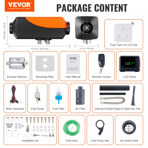 VEVOR Diesel Air Heater 12V 2KW LCD Display Remote Control for Car Bus RV IndoorsRapid HeatingEasy to ControlLow Noise OperationEasy InstallationRapid Heat OutputVersatile ApplicationsFuel Consumption: 0.12-0.26 L/H,BTU: 108-161ft²/10-15 m²,Working Voltage: 12V & 24V,Fuel Tank Volume: 10 L/2.6 Gal,Control Method: LCD+Remote Control,Working Temperature: -40℉-104℉/-40℃-40℃,Applicable Altitude: Below 3000 m/9843 ft,Air Outlet Pipe Inner Diameter: 3 in/76.5 mm,Heating Power: 2KW,Adjustable Temperature Range: 46℉-96.8℉/8℃-36℃,Net Weight: 11 lbs/5 kg,Product Size: 13.4×4.5×5.5 inch/340×115×140 mm