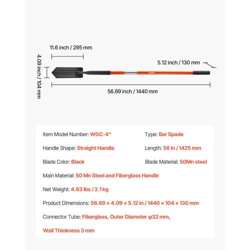 VEVOR Trench Shovel 4 in Trenching Shovel Fiberglass Handle for Digging 56 in<br/>Easy Digging Tasks<br/>Multi-Purpose Shovel<br/>Strong Alloy Blade<br/>Labor-Saving Design<br/>Durable Build Quality<br/>Secure Packaging<br/>Handle Shape: Straight Handle,Blade Material: Alloy Steel,Blade Color: Black,Type: Bar Spade,Connector Tube: Fiberglass, Outer Diameter φ32 mm, Wall Thickness 3 mm,Length: 56 in / 1425 mm,Item Model Number: WGC-4",Product Dimensions: 55.91 x 4.09 x 5.12 in / 1420 x 104 x 130 mm,Net Weight: 4.63 lbs / 2.1 kg,Main Material: 50 Mn Steel and Fiberglass Handle