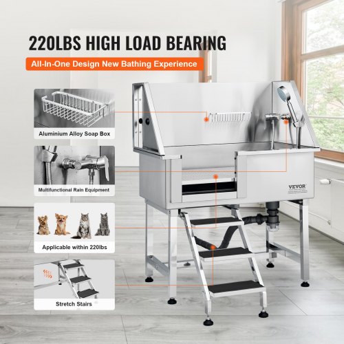 VEVOR 38" Pet Dog Bathing Station w/Ramp, Professional Stainless Steel Dog Grooming Tub w/ Storage Drawer, Floor Grate, Faucet, Dog Bathtub for Large,Medium,Small Pets, Washing Sink for Home(Left)220lbs Weight CapacityCompact DesignVersatile FunctionsStainless Steel AccessoriesEdge-cutting DesignNo Bending for CleaningSize: 38 inch / 965.2 mm,Item Model Number: K1E01017,Load Bearing: 220 lbs / 100 kg,Net Weight: 29.7 lbs / 13.46 kg,Main Material: Stainless Steel