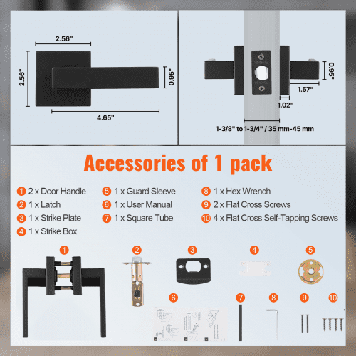 Passage Door Handle 6 Pack Matte Black Door Lever Interior Reversible LeverKeyless SimplicityEffortless InstallationMatte Black FinishEffortless 45-Degree TurnReversible DesignZinc Alloy HandleLatch Backplate Adjustment:2-3/8" to 2-3/4"(60mm/70mm switchable),Handle Size: 4.65" x 0.91" x 2.16" / 118 x 23 x 55 mm,Suitable Door Thickness:1-3/8" to 1-3/4" / 35 mm-45 mm,Color: Black,Item Model Number: KJ2118-PS-BLK,Door Opening: 45° Rotation to Open,Quantity: 6 Pc,Latch Material: Iron,Net Weight: 12.70 lbs / 5.76 kg,Handle Material: Zinc Alloy,Latch Size 2.24" x 1.02" / 57 x 26 mm:,Product Size: 6.30" x 5.51" x 2.56" / 160 x 140 x 65 mm