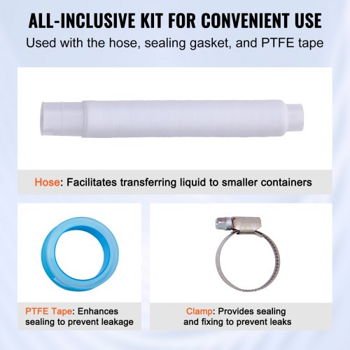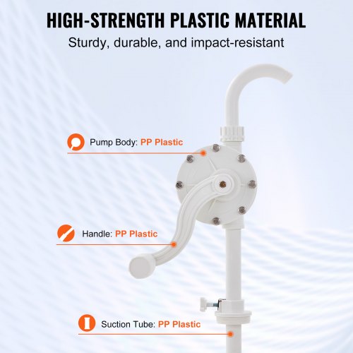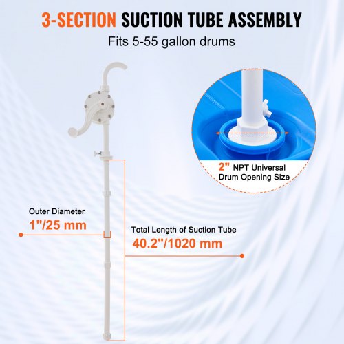 VEVOR Drum Pump, 6.5 GPM Flow, Rotary Barrel Pump Hand Crank, Fits 5 to 55 Gallon Drums with 3-Section Suction Tube Assembly and Hose, Designed for Fast Transfer of Water, Alcohol, Corrosive LiquidsEfficiency in ActionSimplicity at Your FingertipsFits Just RightBuilt to LastFlexes with Your NeedsBountiful AccessoriesOutlet Tube Outer Diameter: Ф1 in/25 mm,Item Model Number: YOILP-HG0012A,Product Weight: 3.3 lbs/1.5 kg,Material: Plastic,Extraction Method: Hand-Operated Rotary,Product Size: 50.8 x 9.1 x 9.1 in/129 x 23 x 23 cm