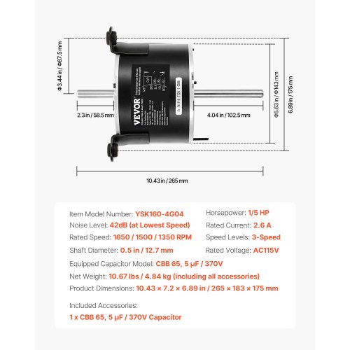 1/5HP RV AC Fan Motor AC115V 2.6A 1650RPM Single Phase with 5uf/370V CapacitorWide CompatibilityHigh PerformanceIdeal ChoiceDurable BearingsEasy to InstallConvenient AccessoryEquipped Capacitor Model: CBB 65, 5 µF / 370V,Rated Speed: 1650 / 1500 / 1350 RPM,Horsepower: 1/5 HP,Item Model Number: YSK160-4G04,Shaft Diameter: 0.5 in / 12.7 mm,Rated Current: 2.6 A,Speed Levels: 3-Speed,Product Dimensions: 10.43 x 7.2 x 6.89 inch / 265 x 183 x 175 mm,Net Weight: 10.67 lbs / 4.84 kg (including all accessories),Rated Voltage: AC115V
