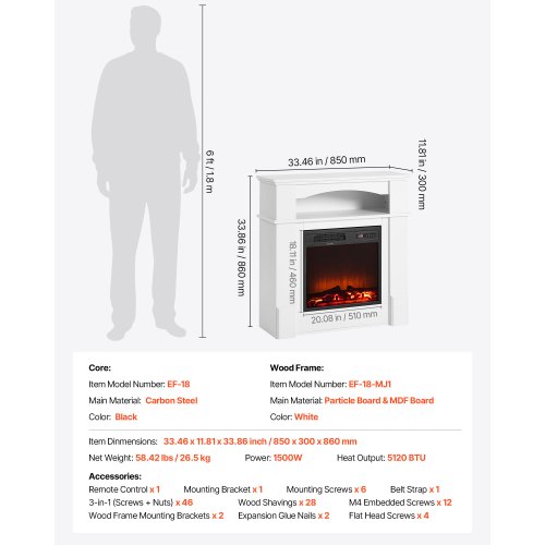 33 Inch Freestanding Electric Fireplace Stove Heater 1500W Mantel White<br/>Multiple Security Protections<br/>Efficient Infrared Heating<br/>Realistic 3D Flames<br/>secure and Reliable<br/>Easy Setup<br/>User-Friendly Design<br/>Installation Type: Freestanding,Color: Core: Black & Wood Frame: White,Item Model Number: Core EF-18, Wood Frame EF-18-MJ1,Wood Frame Dimensions: 33.46 x 11.81 x 33.86 in / 850 x 300 x 860 mm,Material: Wood Frame: Particle Board & MDF Board, Core Housing: Q235A,Net Weight: 21.38 lbs / 9.7 kg,Power: 1500W,Heat Output: 5120BTU,Core Dimensions: 20.08 x 18.11 x 5.51 in / 510 x 460 x 140 mm,Power Supply: Wired