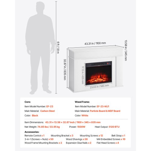 43 Inch Freestanding Electric Fireplace Stove Heater 1500W Mantel White<br/>Multiple Security Protections<br/>Efficient Infrared Heating<br/>Realistic 3D Flames<br/>secure and Reliable<br/>Easy Setup<br/>User-Friendly Design<br/>Installation Type: Freestanding,Color: Core: Black & Wood Frame: White,Item Model Number: Core EF-23, Wood Frame EF-23-MJ1,Wood Frame Dimensions: 43.31 x 13.58 x 32.87 in / 1100 x 345 x 835 mm,Material: Wood Frame: Particle Board & MDF Board, Core Housing: Q235A,Net Weight: 21.38 lbs / 9.7 kg,Power: 1500W,Heat Output: 5120BTU,Core Dimensions: 23.03 x 17.13 x 4.53 in / 585 x 435 x 115 mm,Power Supply: Wired