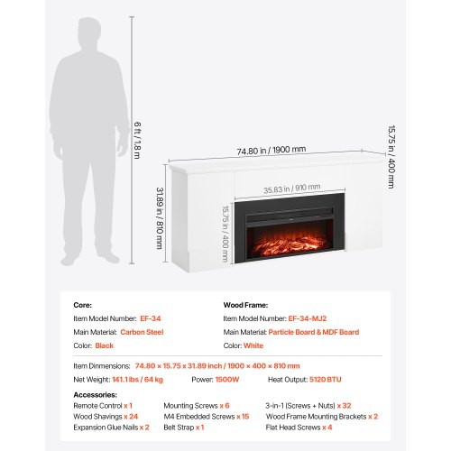 75 Inch Freestanding Electric Fireplace Stove Heater 1500W Remote White<br/>Multiple Security Protections<br/>Efficient Infrared Heating<br/>Realistic 3D Flames<br/>secure and Reliable<br/>Easy Setup<br/>User-Friendly Design<br/>Installation Type: Freestanding,Color: Core: Black & Wood Frame: White,Item Model Number: Core IF-34, Wood Frame IF-34-MJ2,Wood Frame Dimensions: 74.80 x 15.75 x 31.89 in / 1900 x 400 x 810 mm,Material: Wood Frame: Particle Board & MDF Board, Core Housing: Q235A,Net Weight: 21.38 lbs / 9.7 kg,Power: 1500W,Heat Output: 5120BTU,Core Dimensions: 35.83 x 15.75 x 8.27 in / 910 x 400 x 210 mm,Power Supply: Wired