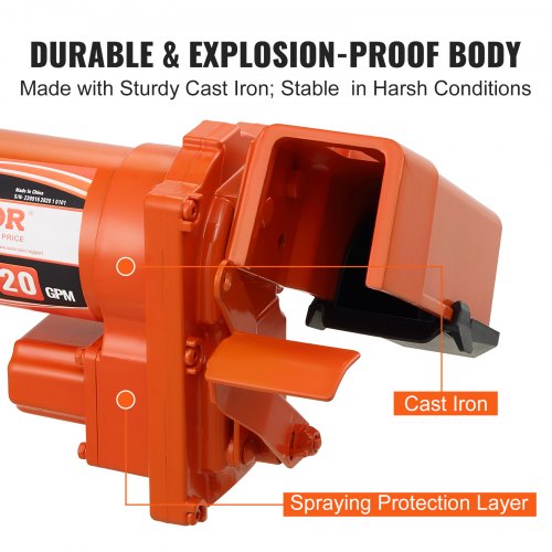 VEVOR Fuel Transfer Pump, 12V DC 20 GPM 1/4 HP, High Flow Cast Iron Gasoline Extractor Pump with Fuel Collection Box Design for Gasoline, Diesel, Kerosene, Ethanol & Methanol Blends, and BiodieselSupercharged FuelingBonus 90° Elbow FittingDrip-Defying DesignRust? Not On Our WatchFuel DiversityUniversal FitSuction Lift: ≥9.8 ft/3 m,Product Type: Explosion-Proof Fuel Transfer Pump,Head Lift: ≥26.2 ft/8 m,Horsepower: 1/4 HP,Applicable Fuel Type: Gasoline/Diesel,Item Model Number: EX56-12,Inlet/Outlet Diameter: 1 in/25.4 mm,Product Weight: 19.7 lbs/8.95 kg,Input Voltage: DC 12V,Max Flow Rate: 20 GPM/75.7 LPM,Main Material: Cast Iron/Aluminum Alloy,Product Size: 13 x 8.9 x 9.6 in/330 x 225 x 245 mm