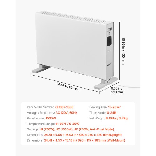VEVOR Convection Panel Heater 1500W Electric Space Heater Remote & Touch Control<br/>Powerful Heater<br/>Efficient Heating<br/>Safety & Reliability<br/>Wall-Mounted & Freestanding Options<br/>Essential for Home<br/>Space-Saving Design<br/>Voltage/Frequency: AC 120V, 60Hz,Item Model Number: CH507-15DE,Temperature Range: 41-95℉ / 5-35℃,Dimensions: 24.41 x 4.53 x 15.16 in / 620 x 115 x 385 mm (Wall-Mount),Rated Power: 1500W,Net Weight: 8.16 lbs / 3.7 kg,Heating Area: 15-20㎡,Settings: H1 (750W), H2 (1500W), AF (750W, Anti-Frost Mode),Timer Mode: 0-24H