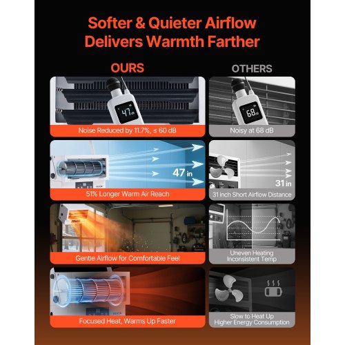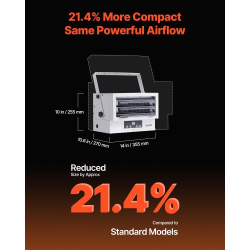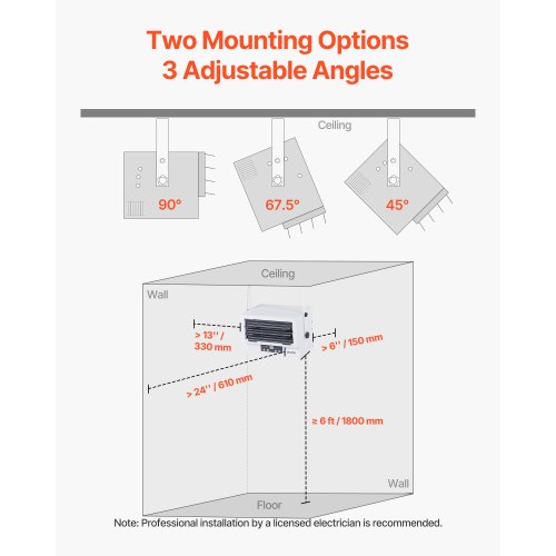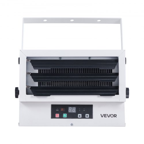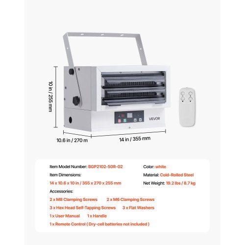 VEVOR Electric Garage Heater 5000-Watt Ceiling Mount With Remote Control<br/>Adjustable & Flexible<br/>Consistent Comfort<br/>Important Note<br/>Installation Guide<br/>Wide Application<br/>Sturdy & Long-Lasting<br/>Installation Method: Wall-mounted / Ceiling-mounted,Color: White,Item Model Number: BGP2102-50R-02,Item Dimensions: 14 x 10.6 x 10 in / 355 x 270 x 255 mm,Material: Cold-Rolled Steel,Heating Levels: 2 Levels (2500W / 5000W),Security Protection: Overheat protection,Thermostat Function: Yes (45–99℉),Net Weight: 19.2 lbs / 8.7 kg,Power: 5000W,Timer Function: Yes (0–9 hours)