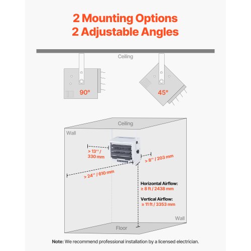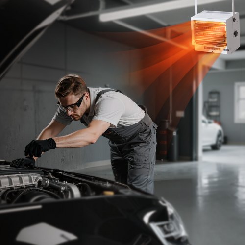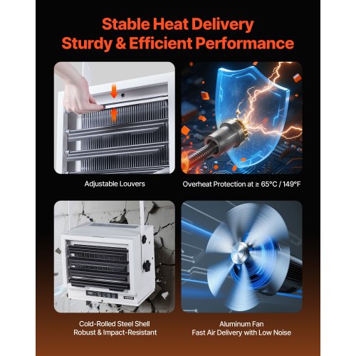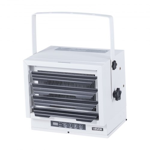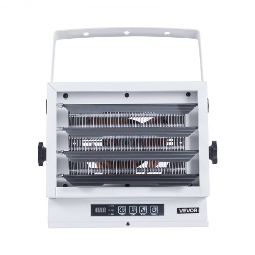 VEVOR Electric Garage Heater 8500W with Remote Control Ceiling for Workshop<br/>Adjustable & Flexible<br/>Consistent Comfort<br/>Important Note<br/>Installation Guide<br/>Wide Application<br/>Sturdy & Long-Lasting<br/>Color: White,Materials: Cold-Rolled Steel Housing, Aluminum Fan Blades,Control Method: Remote control,Power Supply: AC 240V, 60Hz,Installation Method: Wall-mounted/Ceiling-mounted,Item Model Number: HS1285-08E,Item Dimensions: 16.1 x 12.6 x 12.6 in / 410 x 320 x 320 mm,Heating Levels: 2 Levels (5500W / 8500W),Security Protection: Overheat protection,Thermostat Function: Yes (50–95℉),Net Weight: 10.3 kg / 22.7 lbs,Power: 8500W,Timer Function: Yes (0–10 hours)